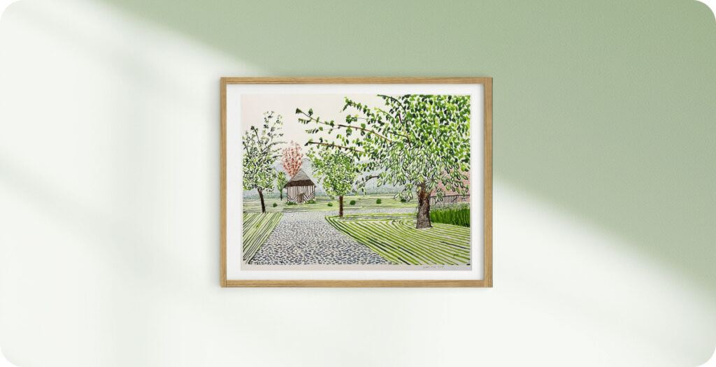 Es stammt aus Hockneys berühmter Normandie-Serie, einem der markantesten Kapitel seiner späten Karriere. In diesen Arbeiten fängt Hockney den Rhythmus der Jahreszeiten und den Charme der französischen Landschaft ein – mit leuchtenden Farben und dem mutigen Einsatz digitaler Werkzeuge. Berühmt wurde er dafür, das iPad als neue Leinwand zu nutzen. Das Ergebnis ist eine faszinierende Verbindung aus Tradition und Innovation.